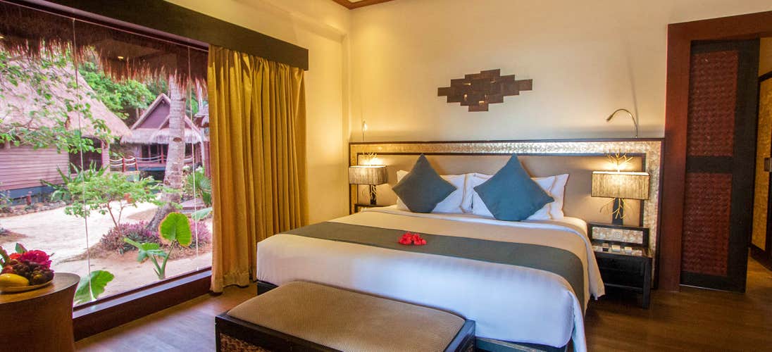 The amenities inside the beach view villa include a king-sized bed, an outdoor shower, a tea-making set, a Nespresso coffee machine, free Wi-Fi, a flat-screen TV, a safety deposit box, a desk, a bathroom with shower, a hairdryer, a minibar, and a terrace. Aside from welcome drinks upon arrival, a choice between a chilled bottle of Warwick Chardonnay or Martini Prosecco, you will get a bouquet of fresh roses and a celebratory cake. There is also a daily complimentary breakfast and a one-time complimentary 10-minute crown massage in this honeymoon package.